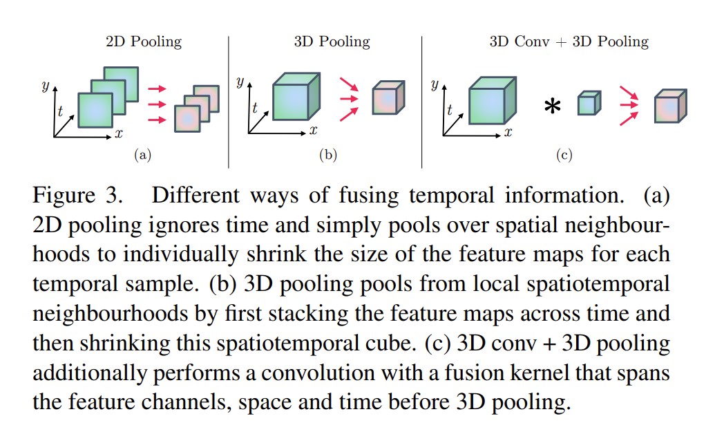 蓝色是空间流,绿色是时间流,对RGB和光流都是分别用两个网络抽特征,在conv做early fusion,然后先3D conv fusion,然后3d pooling,然后特征融合并pool得到fc,算出spatiotemporal损失函数;