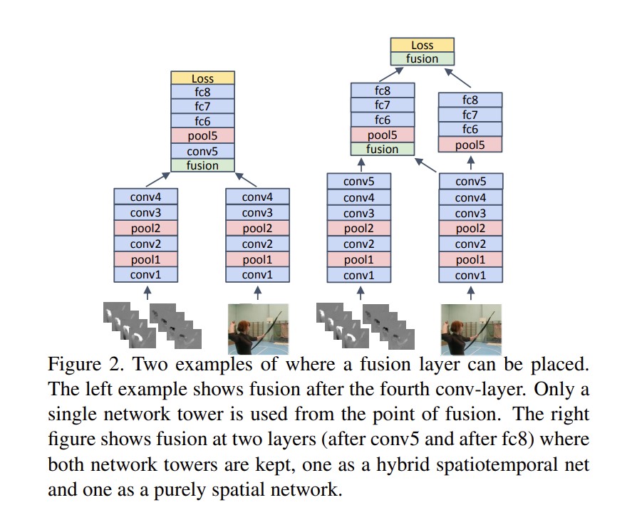 右:表现更好。到conv5时,空间流的特征与时间流合并,产生时空的特征,但是空间流的特征继续用。在fc8再次合并。