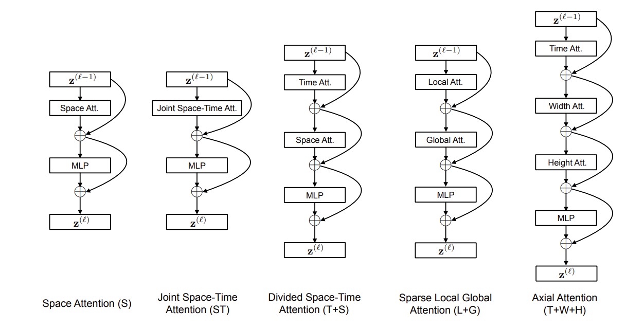 第2个是把三个维度一起做注意力,gpu内存装不下。3: 先在时间上注意力,然后在空间上注意力。4: 先在局部注意力,然后在全局算。5: 分别延3个轴做自注意力。