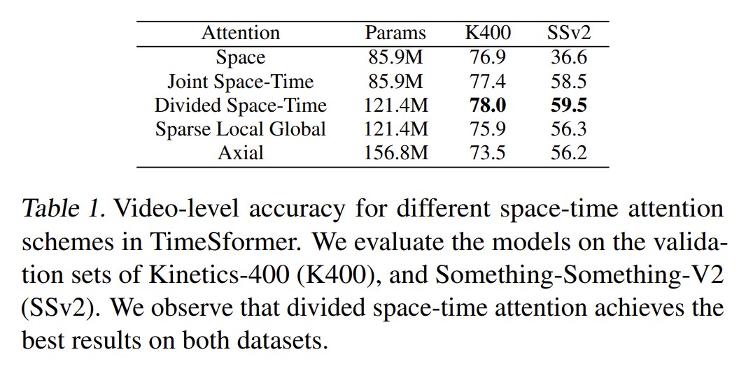 - Bertasius, Gedas, Heng Wang, and Lorenzo Torresani. “Is space-time attention all you need for video understanding?.” ICML. Vol. 2. No. 3. 2021.